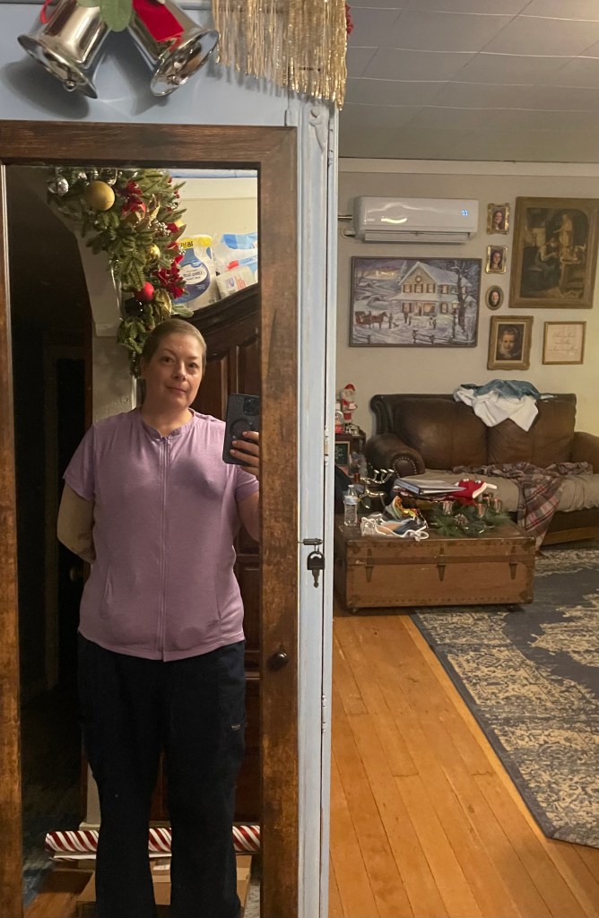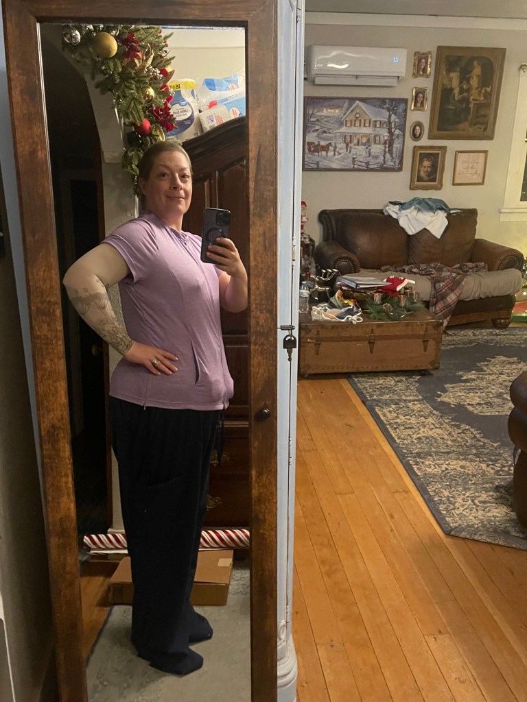 The day of surgery I felt much calmer and there were less residents/students involved due to being a holiday. I woke up in some pain and the nurse quickly gave me some pain meds in my IV. They did not wrap me at all and only put tape on my incisions so I looked down my hospital gown fairly quickly and assessed the situation. I’m not entirely flat because the plastic surgeon installed chest expanders or what I think of as my inflatables after my oncologist removed all my breast tissue. The plastic surgeon put in some air and will continue to “pump me up” over the upcoming weeks and months until I reach a size in my chest cavity that I aspire to. It’s weird being able to feel where the inflation port is under the skin. I get winded just thinking about it, remembering the years of blowing up pool dolphins and inner-tubes during the summer, the scent of sunscreen wafting in the air. I have no nipples of course. The area on my chest where they were is covered by tape. I have two drains, one on each side. I feel like an old pro when it comes to drain care thanks to my previous lumpectomy.