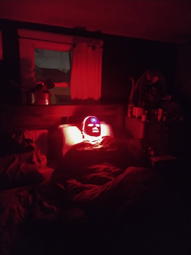 I’ve got to tell you that losing my breasts and my long curly hair have really made me go on a quest to make myself feel better about my appearance. Perhaps you’ve heard about the benefits of red light therapy for the skin. Perhaps you think it’s a crock of crap. Perhaps you too have had your husband enter the bedroom to find you emitting a strange red light. I had my ear buds in and my eyes closed “visualizing” what I wanted my future to look like. I slowly became aware of a presence in the room. It was not a ghost, or a heavenly presence. It was Jeff trying to hold back his laughter while taking my picture accompanied by a very concerned Rocky.